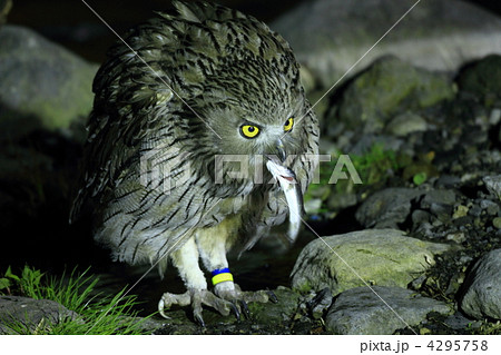 魚をくわえたシマフクロウ