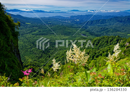 戸隠山・八方睨のシモツケソウの花と富士山・八ヶ岳の眺め