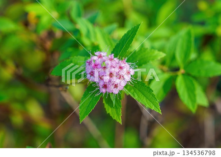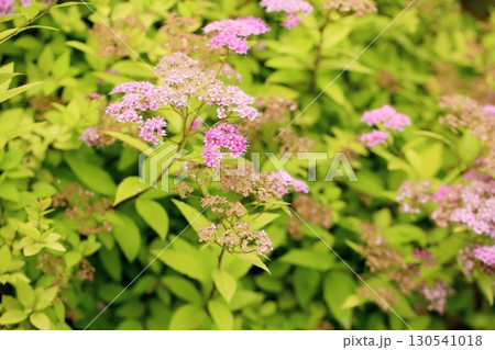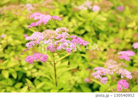 Blooming Japanese spirea with pink clusters in a garden, fresh greenery, horizontal
