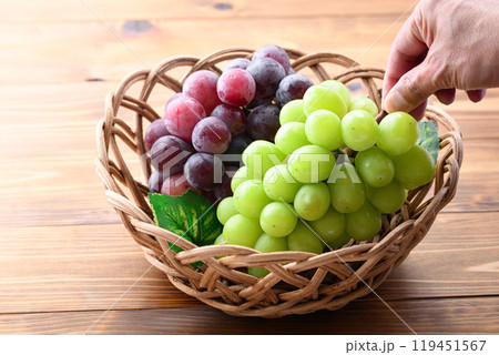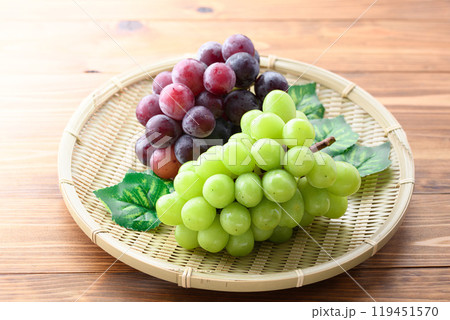 秋の味覚 シャインマスカットとピオーネ ( 木目背景 )