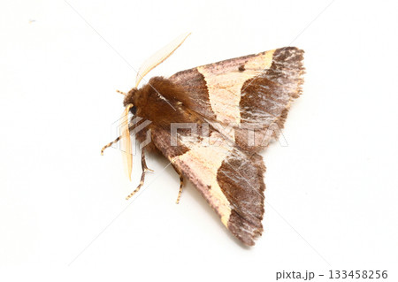 白バックに翅を広げて止まるヨモギエダシャク蛾の成虫