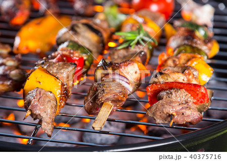 Grilled meat on stick. Bbq kebab dish. Roasted beef