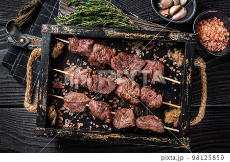 BBQ Beef veal shish kebab Skewers. Black background. Top view
