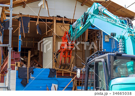 ショベルカーを使用した解体作業。建物の取り壊し。