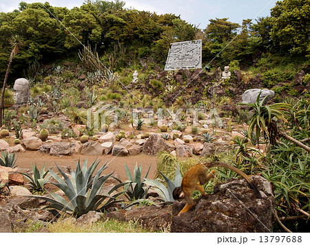 伊豆シャボテン動物公園 誰もいない屋外テラス ベンチとテーブルの風景