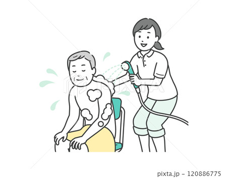 入浴介助をする介護士とシャワーを浴びる高齢男性の上半身イラスト