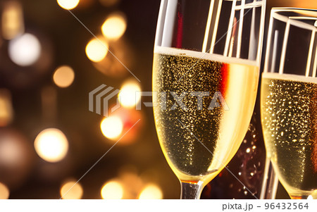 よく冷えたシャンパン(スパークリングワイン)が注がれたふたつのフルートグラスで、乾杯のイメージ