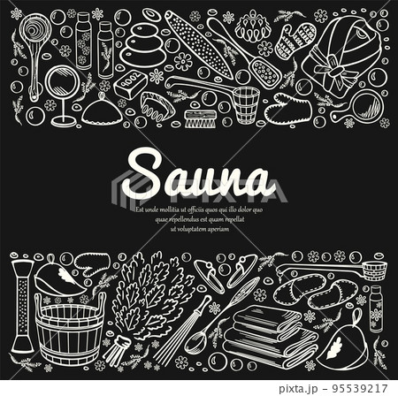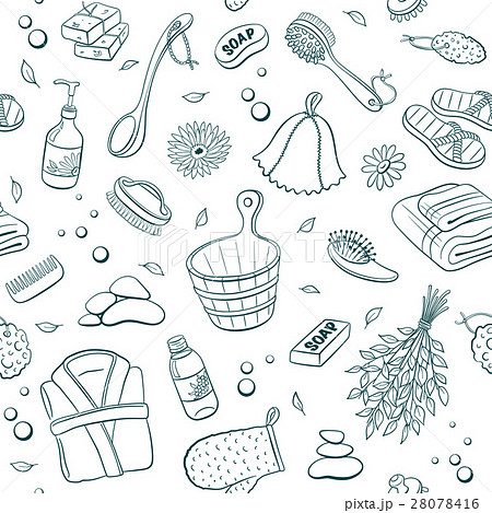 Sauna seamless pattern. Relax wellness spa center element, green broom for steam room, soap, brush. Print for fabric, wallpaper design, nowaday vector background