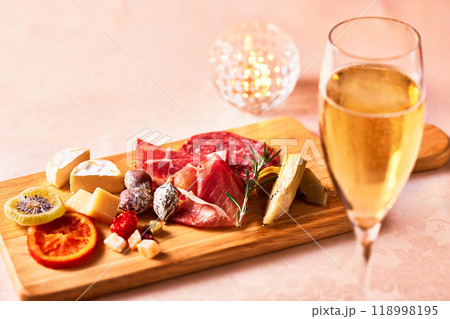 クリスマスのシャンパンの瓶とシャンパンが注がれたグラスのセット_紅白カラー