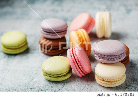 Multicolored macaroni cookies lie on a gray stone slab.