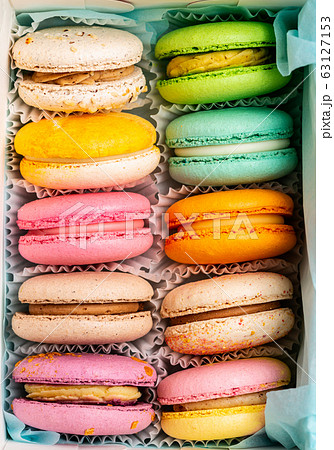Multi-colored macaroons with different tastes in a gift box. Macro.