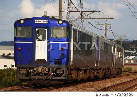 信越本線「快速・越乃Shu*Kura」日本海の海を背景に