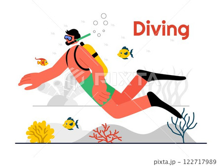 Diving Sport Vector Illustration Featuring Underwater Swimming Equipment for Exploring Coral Reefs, Sea Flora and Fauna, and Marine Life in the Ocean