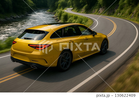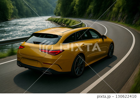 躍動感溢れる黄色シューティングブレークの走行「AI生成画像」
