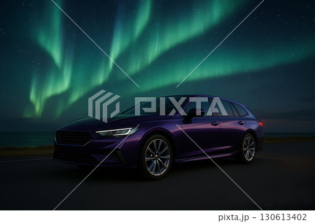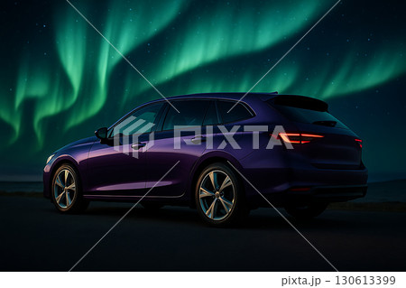 オーロラの夜空に映える紫色シューティングブレーク「AI生成画像」