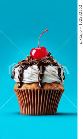 Delicious Chocolate Cupcake Topped With Frosting, Cherry, and Chocolate Drizzle on Blue Background