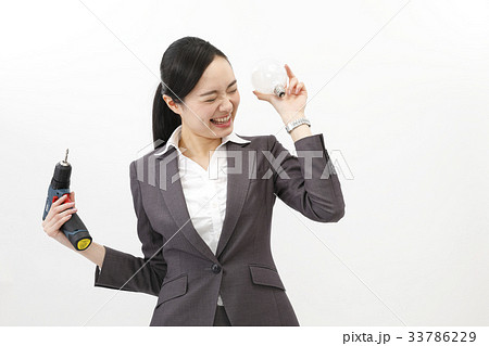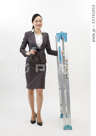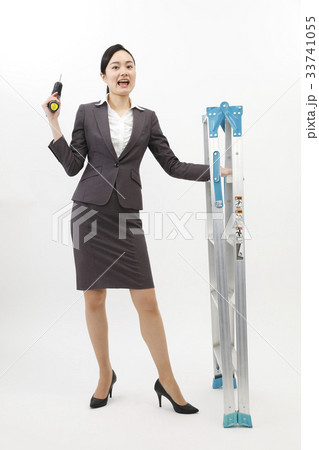 脚立持つビジネスウーマン ビジネススーツ 女性 白バック 全身