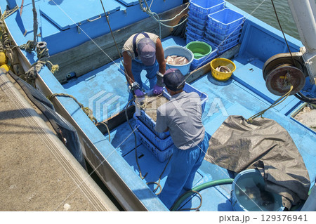 寄港後シラス漁のシラスを下ろすシラス漁船