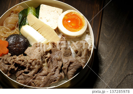 具材たっぷりすき焼き弁当を白背景で撮影