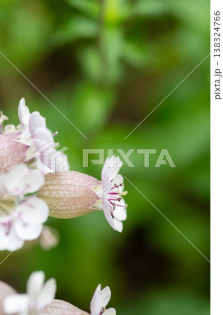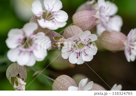 Bladder campion or Maidenstears Silene vulgaris. Bladder campion with bell-shaped white blossoms, selective focus, close-up.