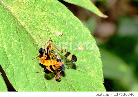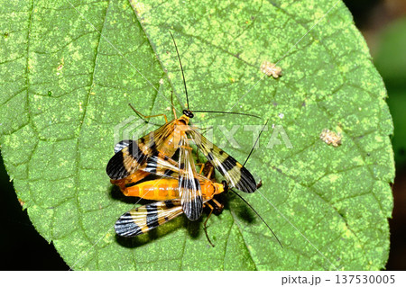 日本のヤマトシリアゲ春型の交尾風景(自然環境下ストロボマクロ撮影)