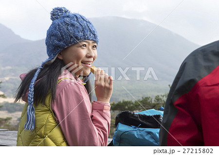 山でシリアルバーを食べる女性