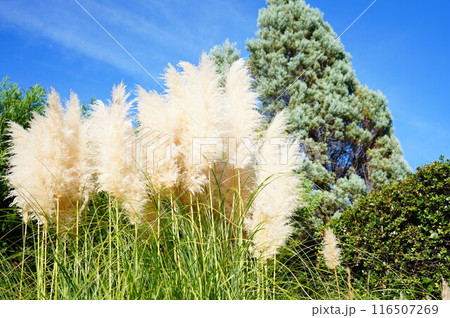 パンパスグラス(シロガネヨシ)と青空の風景
