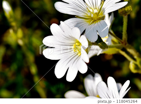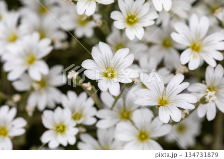 Close-up of delicate white Cerastium flowers in bloom