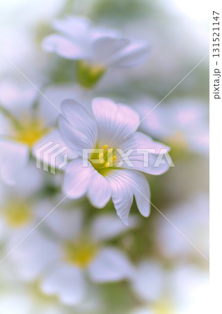 初夏のイメージ 白い5枚の花弁を持つ可憐な白耳菜草(シロミミナグサ)のクローズアップ
