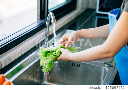 Asian hands woman washing vegetables salad and preparation healthy food in kitchen.