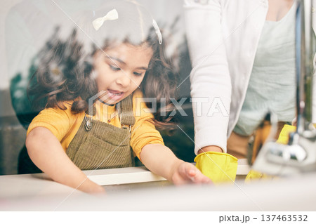Girl, learning and washing dishes with mom in kitchen, help or show skills in house for development. Cleaning, mother and daughter by sink, hygiene or teaching with support, bacteria or dirt in home