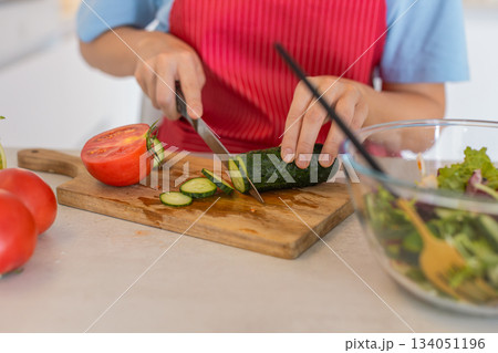 Young woman in kitchen wearing apron slices cucumber on board with tomatoes makes fresh salad bowl