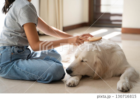 飼い主に優しくブラッシングしてもらうゴールデンレトリーバー
