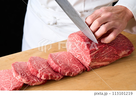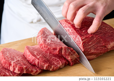 国産の黒毛和牛もも肉(シンシン)をカットする料理人