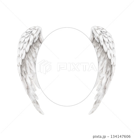 Watercolor oval frame with white angel wings, perfect memorial template for remembrance cards, tribute invitations, condolence souvenirs, photo decoration, or spiritual keepsake stationery design