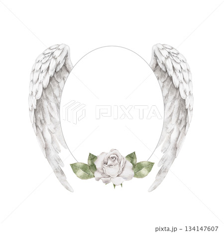 Memorial wreath frame with white angel wings, oval shape, and single white rose with green foliage, watercolor design for condolence templates, sympathy invitations, memorial cards, spiritual gifts