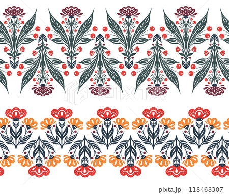 Vector set of seamless decorative borders with flowers isolated from background. Collection of colorful folk art friezes for brushes