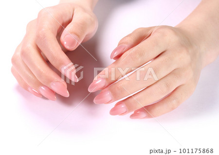 白背景で撮影したナチュラルネイルをした日本人女性の手