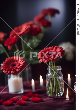 A serene display of red gerbera daisies and roses on a memorial table, framed by a luxurious velvet backdrop to honor the departed.