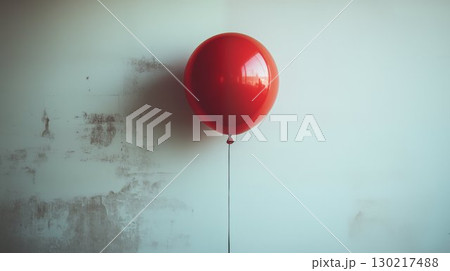 Red balloon floating against minimalist wall, conceptual solitude image