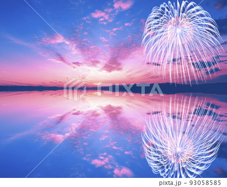 湖面に反射する花火と夕焼け。夏の夕暮れのイメージ。