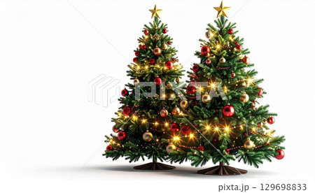 Two Decorated Christmas Trees with Red and Gold Ornaments on White Background