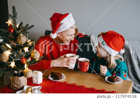 Mother and daughter enjoying Christmas treats together. Holiday desserts, festive food, family bonding, Christmas celebration, sharing sweets, cozy winter moments.