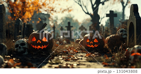 Creepy Halloween Scene With Glowing Pumpkins and Skulls in an Autumn Graveyard.