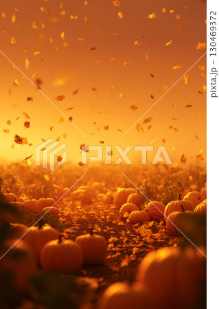 夕暮れのかぼちゃ畑と舞い散る落ち葉の幻想風景