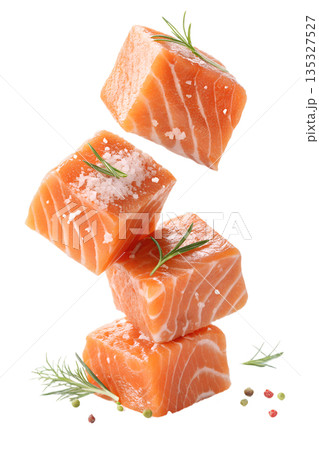 Fresh, vibrant raw salmon cubes levitating with sprigs of rosemary and sea salt crystals, isolated. Perfect for healthy recipes and gourmet concepts