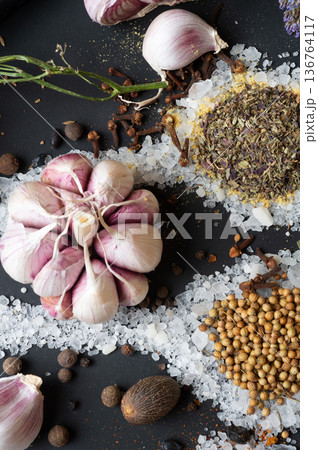 seasonings background with garlic and Spices served at black. Colorful natural meal additives. healthy food concept. close up