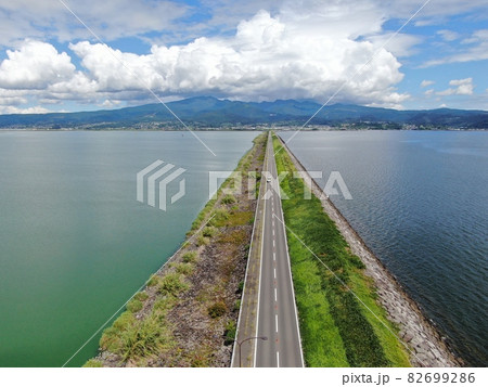 諫早湾を貫く潮受け堤防の直線道路の空撮