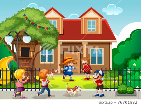 Outdoor scene with many children playing in front of the house
