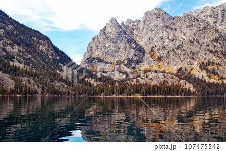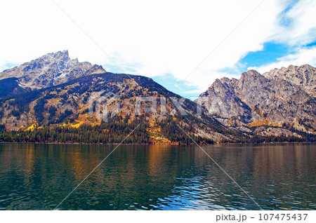 アメリカ合衆国 秋のグランドティトン国立公園 グランドティトン ジェニーレイク東岸ボート乗り場からの